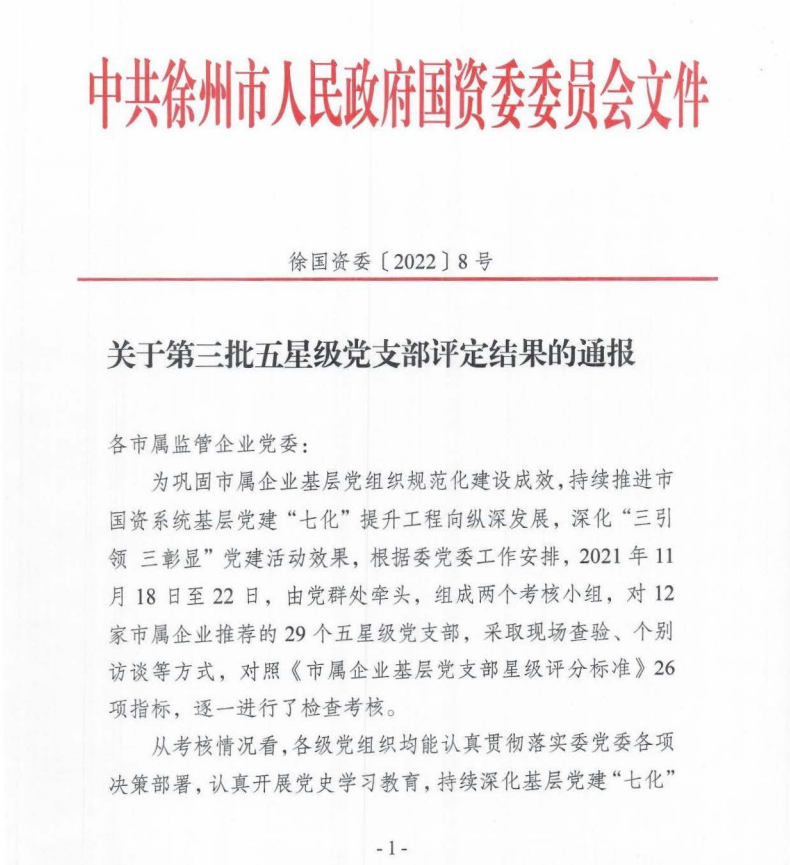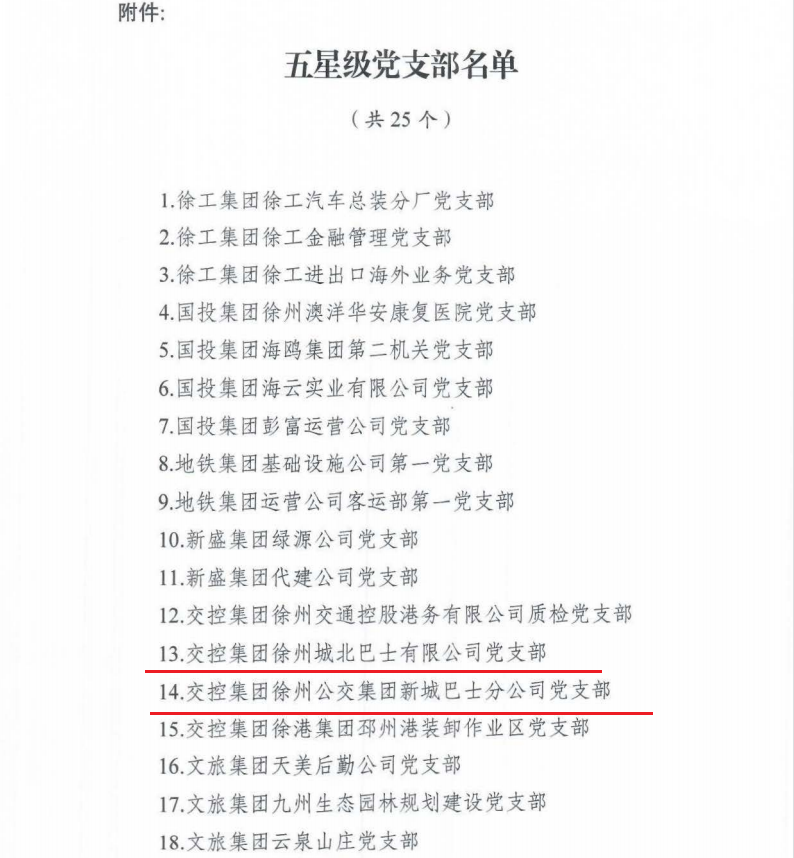 市國資委黨委還下發(fā)了《關(guān)于第三批五星級黨支部評定結(jié)果的通報(bào)》,其中徐州公交城北巴士公司黨支部、新城巴士公司黨支部被命名為“五星級黨支部”。