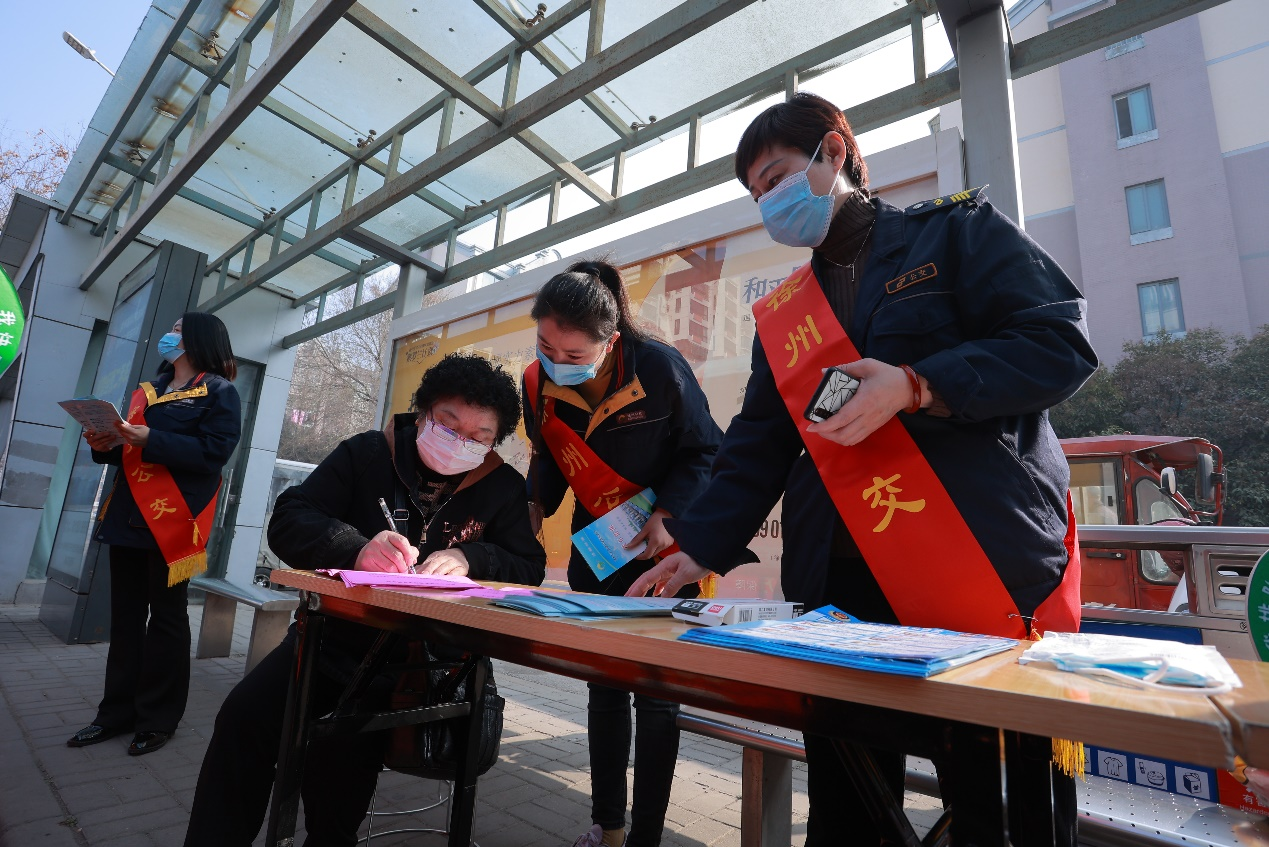 活動(dòng)現(xiàn)場(chǎng),懸掛起了標(biāo)有“公交送溫暖、服務(wù)走在前”的橫幅標(biāo)語(yǔ),志愿者們統(tǒng)一身著行業(yè)服,身披鮮紅綬帶。大家分工明確,以飽滿(mǎn)的精神面貌向市民宣傳綠色出行,發(fā)放《徐州公交乘車(chē)線路指南》,引導(dǎo)市民文明乘車(chē),解答市民問(wèn)題,協(xié)助駕乘人員做好“健康碼”查驗(yàn)工作,幫助老年人注冊(cè)“健康碼”,教老年人使用“徐州公交”APP查詢(xún)公交線路實(shí)時(shí)狀態(tài),攙扶特需乘客上下車(chē)等。