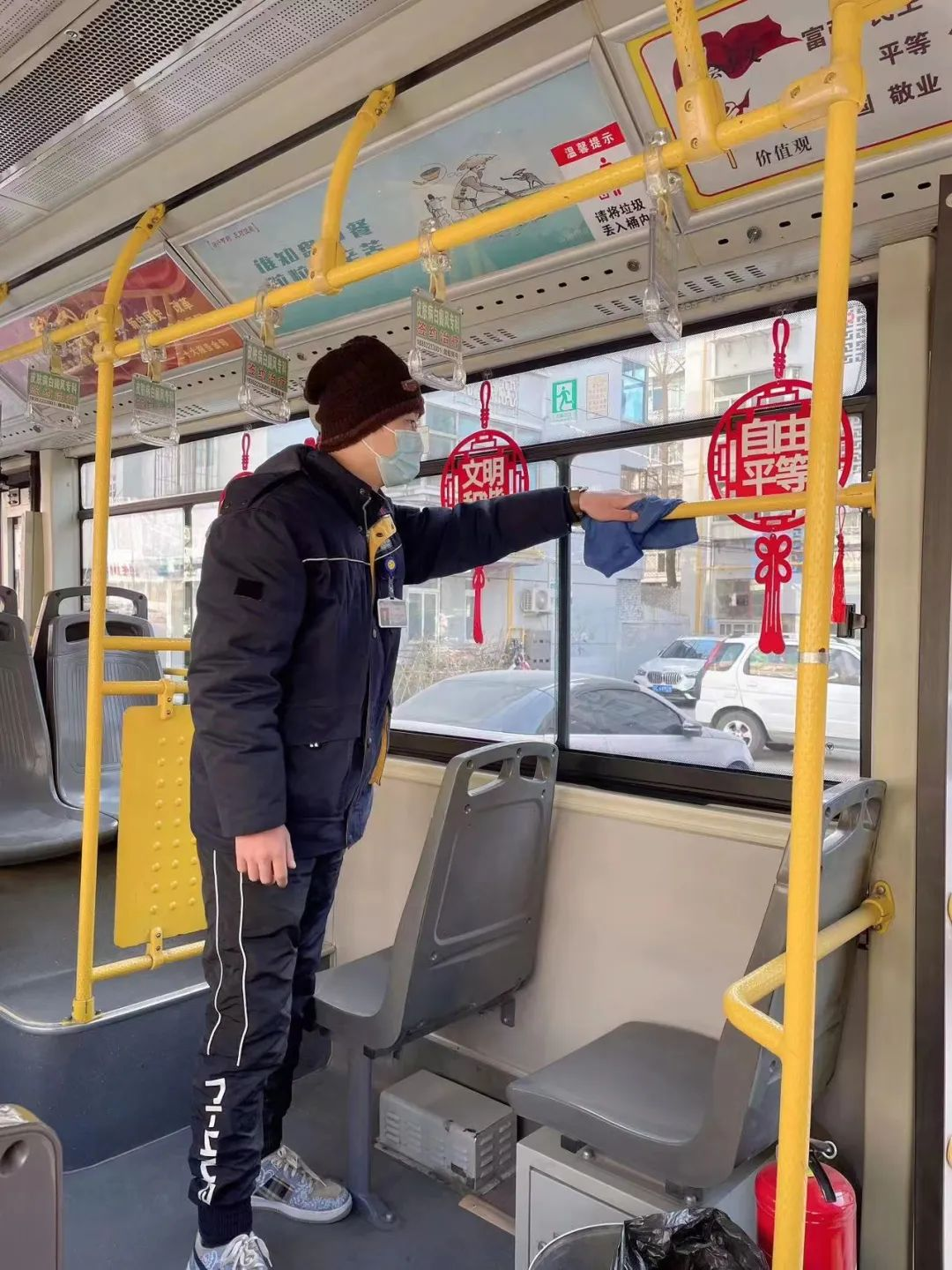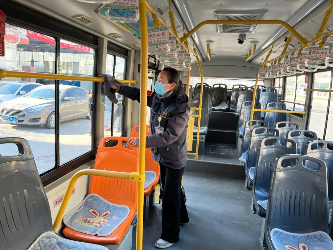 王海芬跑的這條線路,穿過數(shù)條主干道,經(jīng)過工人醫(yī)院、兒童醫(yī)院等一個個醫(yī)療中心。“這幾天有一位乘客,兒子剛動完手術,他每天要到醫(yī)院送飯。每次上車,我們都會互相寒暄幾句,心里也暖暖的。”為了自己的健康也為了他人的健康,王海芬利用休停時間把座椅、扶手等地方用消毒液進行擦拭,每一趟的間隙開窗通風,保證車內(nèi)空氣流動,她在車內(nèi)配備了藥箱,里面有口罩等防疫物資以備乘客不時之需。