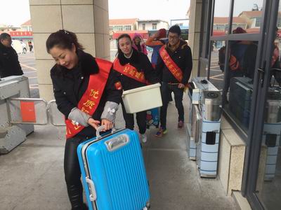 ?xml:namespace>。志愿者們身披綬帶深入各大站點(diǎn)、車(chē)場(chǎng),開(kāi)展站臺(tái)咨詢(xún),導(dǎo)乘服務(wù),主動(dòng)扶老攜幼,為乘客兌換零錢(qián),共發(fā)放乘車(chē)指南1000余份,深受乘客歡迎。圖為賈汪公司志愿者在幫助江蘇安全技術(shù)職業(yè)學(xué)院開(kāi)學(xué)返校的學(xué)生運(yùn)送行李。