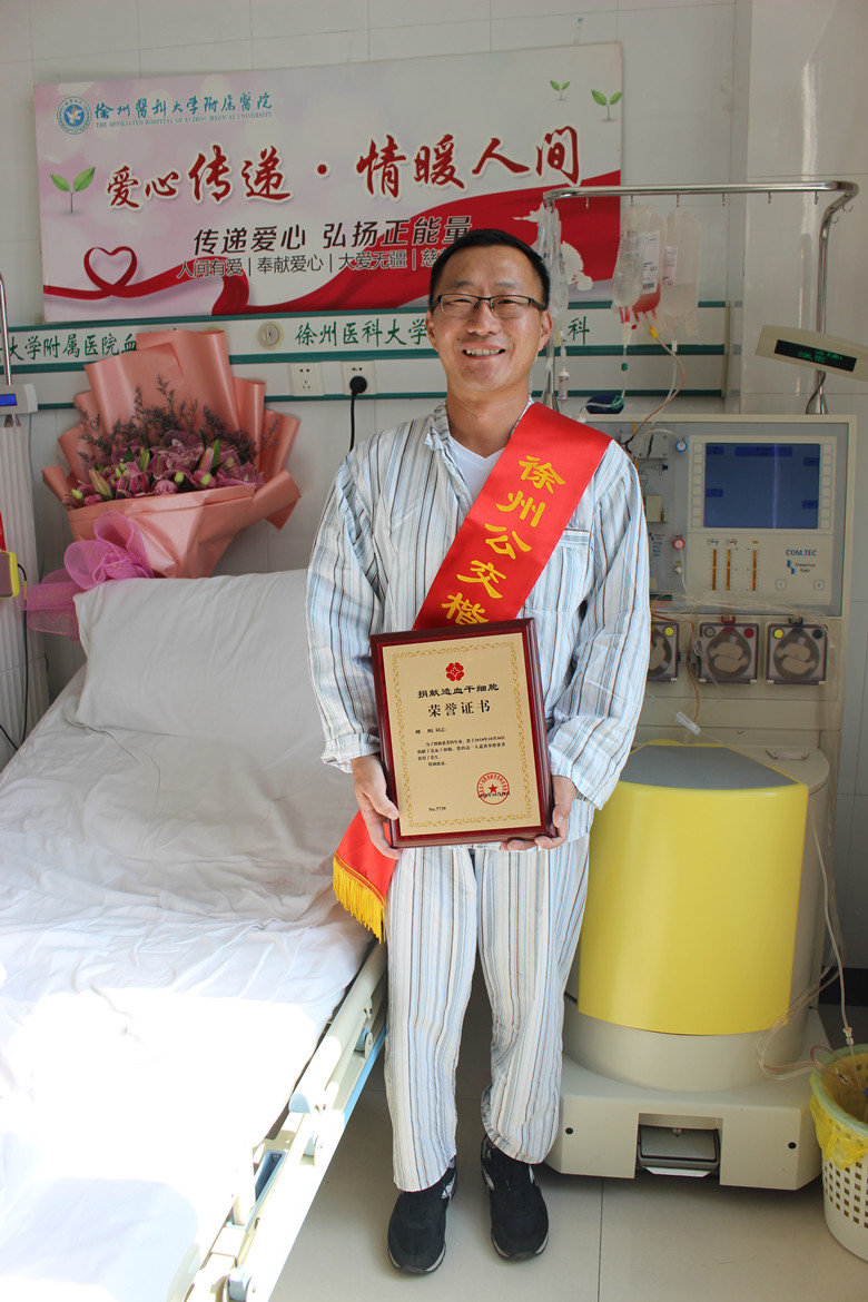 2018年10月30日上午8時許,徐州醫(yī)科大學附屬醫(yī)院血液科,37歲的公交小伙兒鄭剛異常平靜地躺在病床上,殷紅的鮮血汩汩從兩只手臂上連接著不停運轉(zhuǎn)地造血干細胞采集機器的針管間流淌,經(jīng)約3小時的采集,這份帶著濃濃深情和殷切希望、143毫升的造血干細胞混懸液,將為一名3歲白血病男孩送去生命的火種。鄭剛也成為徐州公交系統(tǒng)首例、徐州市第77例造血干細胞的捐獻者。