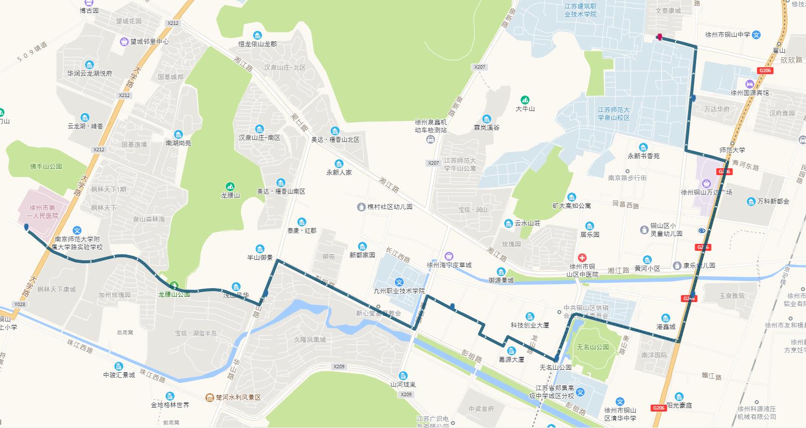 線路站點(diǎn):建筑學(xué)院、江蘇師范大學(xué)、師范大學(xué)地鐵站、萬科新都會、港鑫城、南洋國際、康樂園南門、無名山公園地鐵站、銅山區(qū)政府、楚河金茂府、嵩山路、銅山新區(qū)總站、久隆鳳凰城北門、保利迎賓館、龍腰山公園、泉山森林海、第一人民醫(yī)院南門。