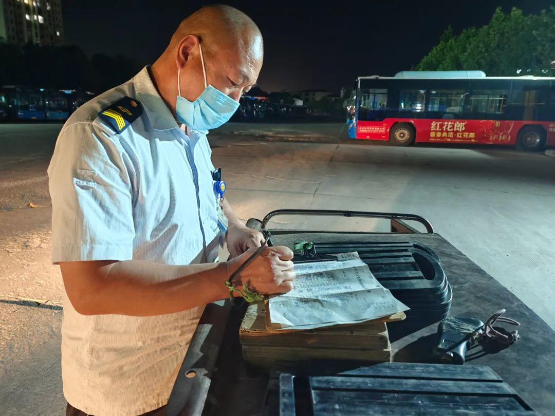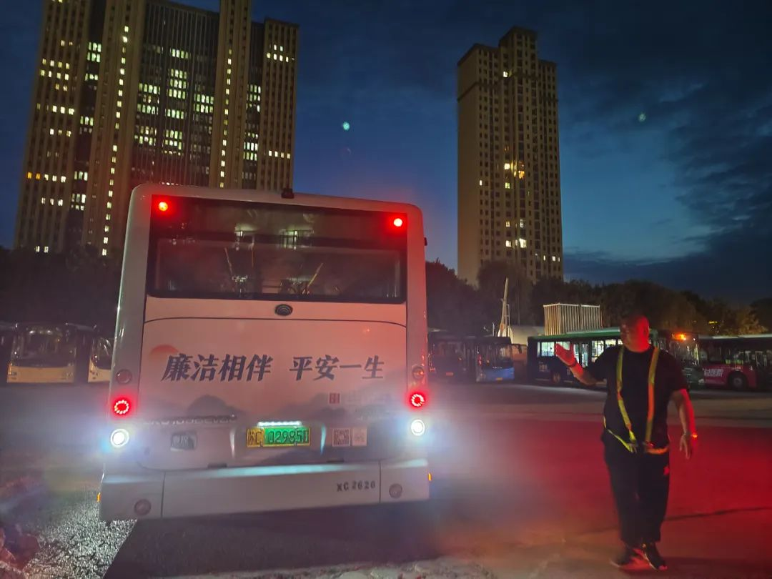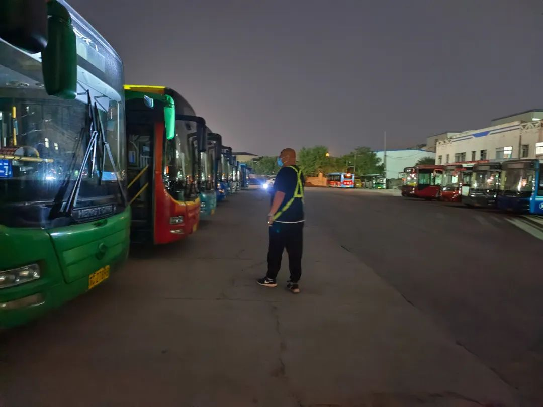進(jìn)入丑時(shí),許多人都已進(jìn)入夢(mèng)鄉(xiāng),末班車(chē)回場(chǎng),在萬(wàn)籟俱靜的夜里,內(nèi)保員徐智指揮倒車(chē),同時(shí)還要逐個(gè)檢查停車(chē)場(chǎng)內(nèi)的車(chē)輛擺放,匯報(bào)車(chē)輛歸場(chǎng)情況,確保車(chē)輛全部安全歸場(chǎng)。