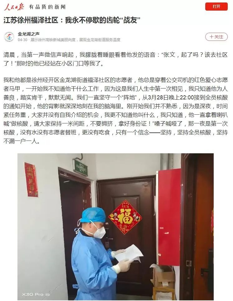 今年3月底,疫情在徐州蔓延,徐州公交停運。鹿偉積極響應(yīng)號召,在經(jīng)開區(qū)金龍湖街道福澤社區(qū)做起了防疫志愿者,測溫、登記、消毒,只要是需要的地方都可以看到他忙碌的身影。在全員核酸檢測的進(jìn)程中,福澤社區(qū)部分工作人員因接觸密接人員而被隔離,志愿者便擔(dān)負(fù)起各個核酸點位的工作。從那時起,鹿偉便總是早晨第一個來,晚上最后一個走。全員核酸一輪接一輪,不管安排什么工作,他每天都如約而至,從不遲到,從不停歇。而他口中永遠(yuǎn)都只有一句話:“只要沒開工,我就天天干,開工了我就要上班去。”多么淳樸的一句話,簡潔明了,可是,卻無不透露著他內(nèi)心深處的干凈、純粹、無私、大愛、無怨無悔。很多人會問他為什么這么堅持不懈,是什么讓他這樣干勁十足,他的回答一直都是:“我喜歡付出,我覺得這樣活得很踏實、很充實,家里人也很支持我。”