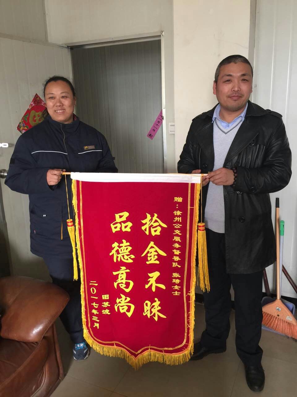 3月29日,正在站臺執(zhí)勤的督導員張琦撿到乘客掉落的公文包,經(jīng)查看發(fā)現(xiàn)包內(nèi)有蘋果筆記本一臺和一個錢包,但并沒有找到皮包主人的聯(lián)系方式。張琦把包放在了調(diào)度室等待失主來認領,約一小時后失主匆忙趕來尋找。失主見到失而復得的皮包非常激動,經(jīng)過詢問得知失主姓田在徐州礦業(yè)大學工作。田先生說,“電腦里存有非常重要的資料和聯(lián)系方式,丟包之后萬分焦急,真心感謝公交督導員?!彪S即從錢包里拿出400元錢塞給張琦作為答謝,張琦表示:“路不拾遺本就是自己的義務,作為站臺督導員經(jīng)常會在站臺撿到乘客掉落的物品,不管東西貴重與否我們都會幫失主妥善保管等待認領?!?/span>3月31日,田先生和他的愛人送來錦旗表示感謝!