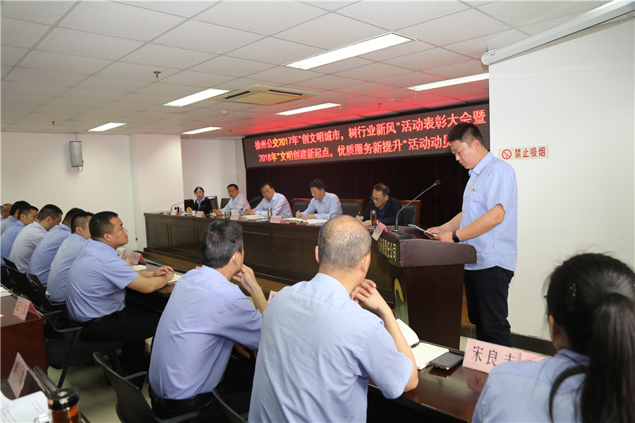 調(diào)研員祖伯鴻宣讀了《關(guān)于表彰2017年度“創(chuàng)文明城市、樹行業(yè)新風”先進集體和先進個人的決定》。大會對獲得榮譽的先進集體和個人代表進行了頒獎。新區(qū)公司黨支部書記李強、順通公司三車隊隊長鹿小可、11路駕駛員曹瑞國等三位同志作了大會交流發(fā)言。
