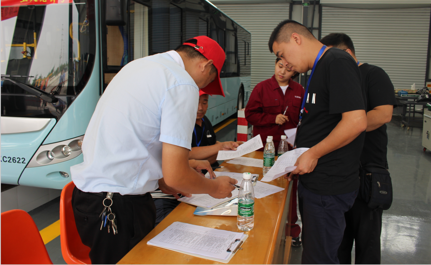 比賽開始了!參賽選手們穿戴整齊的工作服,個(gè)個(gè)卯足了勁,整裝待發(fā)。整潔的維修車間兩個(gè)工作臺(tái)上,四組修理人員同時(shí)進(jìn)行盤式制動(dòng)器拆裝組合的項(xiàng)目比賽,四名裁判員認(rèn)真對(duì)照標(biāo)準(zhǔn)計(jì)分,現(xiàn)場(chǎng)安靜得只聽見制動(dòng)器拆裝時(shí)輕微的“啪啪”聲。一旁的4個(gè)檢修地溝上,分別停著4輛新能源純電動(dòng)公交車,同時(shí)進(jìn)行著新能源車電控故障排除項(xiàng)目的比賽。參賽人員時(shí)而在駕駛室時(shí)而在車廂尾部檢修電路,裁判員根據(jù)實(shí)際操作隨機(jī)提問(wèn)、記錄。